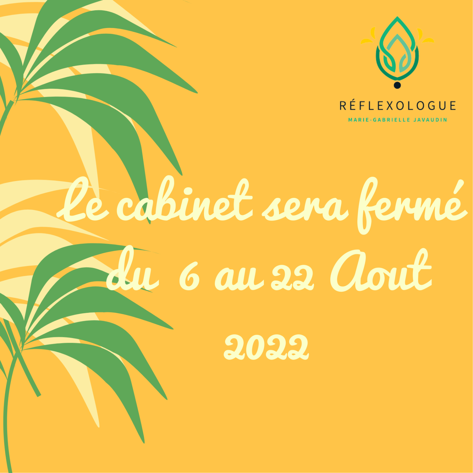Une petite pause pour se ressourcerLe cabinet sera fermé du 6 au 22 aout 2022 Vous pouvez toujours prendre rendez-vous sur https://reflexologie44.com Je reste disponible par mail. Bel été