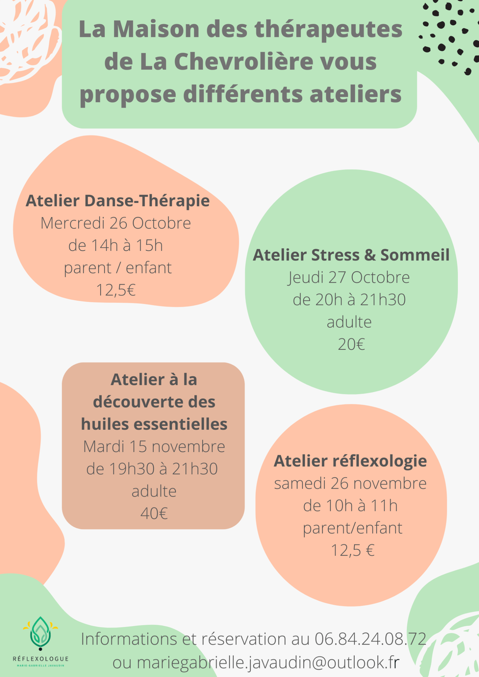 Atelier Danse-Thérapie avec @sandrawalle44parent/enfantmercredi 26 octobre de 14h à 15h12,5€ Atelier Stress & Sommeiloutils et astuces pour retrouver le sommeil avec Sandrine mandin et moi mêmeadultejeudi 27 octobre de 20h à 21h3020 € Atelier à la découverte des huiles essentielles et la trousse familiale d’urgence avec @unzestdaromaadulteMardi 15 novembre40 euros Atelier réflexologie avec moi mêmeparent/enfantsamedi 26Lire la suite « La maison des thérapeutes de La Chevrolière vous propose différents ateliers »